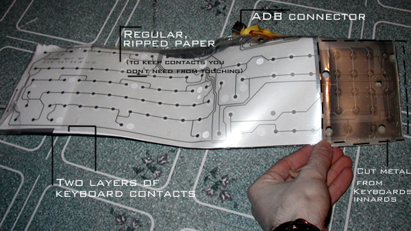 When the two layers of plastic - metal contacts are tapped, they connect, and register as a key being pressed on the macintosh. So, I took a piece of regular paper and slid it in bettween the two layers of contacts (all the keys other than the Keypad). This prevents them from being triggered when you bend the under layers around a cut piece of metal (also from the keyboard).