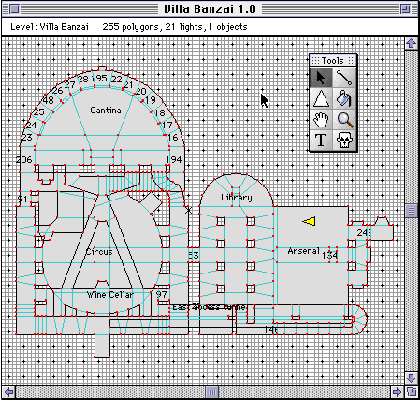 Forge is Bungie's full-featured map editor. It can create maps for Infinity or Marathon II and offers a feature that no other Marathon map editor has - while editing, you can go to "preview" mode and see exactly how the map will look when you play the game, sans aliens and weapons. Walk around and use the convenient palettes to apply textures and lighting modes, drag walls to align textures, and raise floors with a simple click-and-drag. In drawing mode, you can create the basic map shapes, add objects, customize liquids and lighting sets, etc. As someone who used Pfhorte (a freeware map editor for Marathon I and II), I was immediately impressed with the ease of tweaking existing maps or converting old Marathon I maps to use with Infinity. I fired up Forge and within minutes had turned one of my original Marathon I maps into a network level for Infinity.
