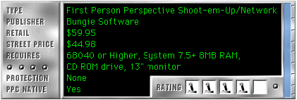 It's difficult to find nits to pick with Marathon Infinity. Sadly, there are no new types of network games, like the long-promised and never-delivered Capture the Flag. In fact, *no* real features have been added to Marathon itself, save for an option to draw the entire screen on large monitors. The new texture artwork makes a world of difference in atmosphere, though the artwork for aliens and Bobs remain from Marathon II. The Infinity scenario is a true work of art, and the pile of included network maps is enough to keep the most demanding players busy. If you have Marathon I or II and want to pick up the final part of the saga, or simply want to play Bungie's finest production to date, pick up Marathon Infinity.