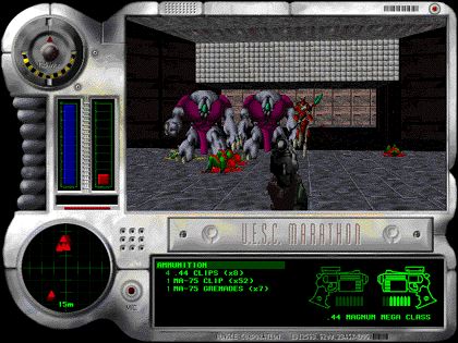 While Marathon retains some of the puzzle-solving aspects of Pathways, and includes many scenarios where progressing depends on your dexterity, it doesn't suffer from the latter's identity's crisis. Pathways talked like a mindless shoot 'em up but played more like an adventure game. That's not to say that Marathon is mindless. While battling an alien invasion, you discover that one of the ship's artificial intelligences, Durandal, has gone "rampant", a cybernetic psychosis that makes 2001's HAL seem about as threatening as your average pocket calculator.