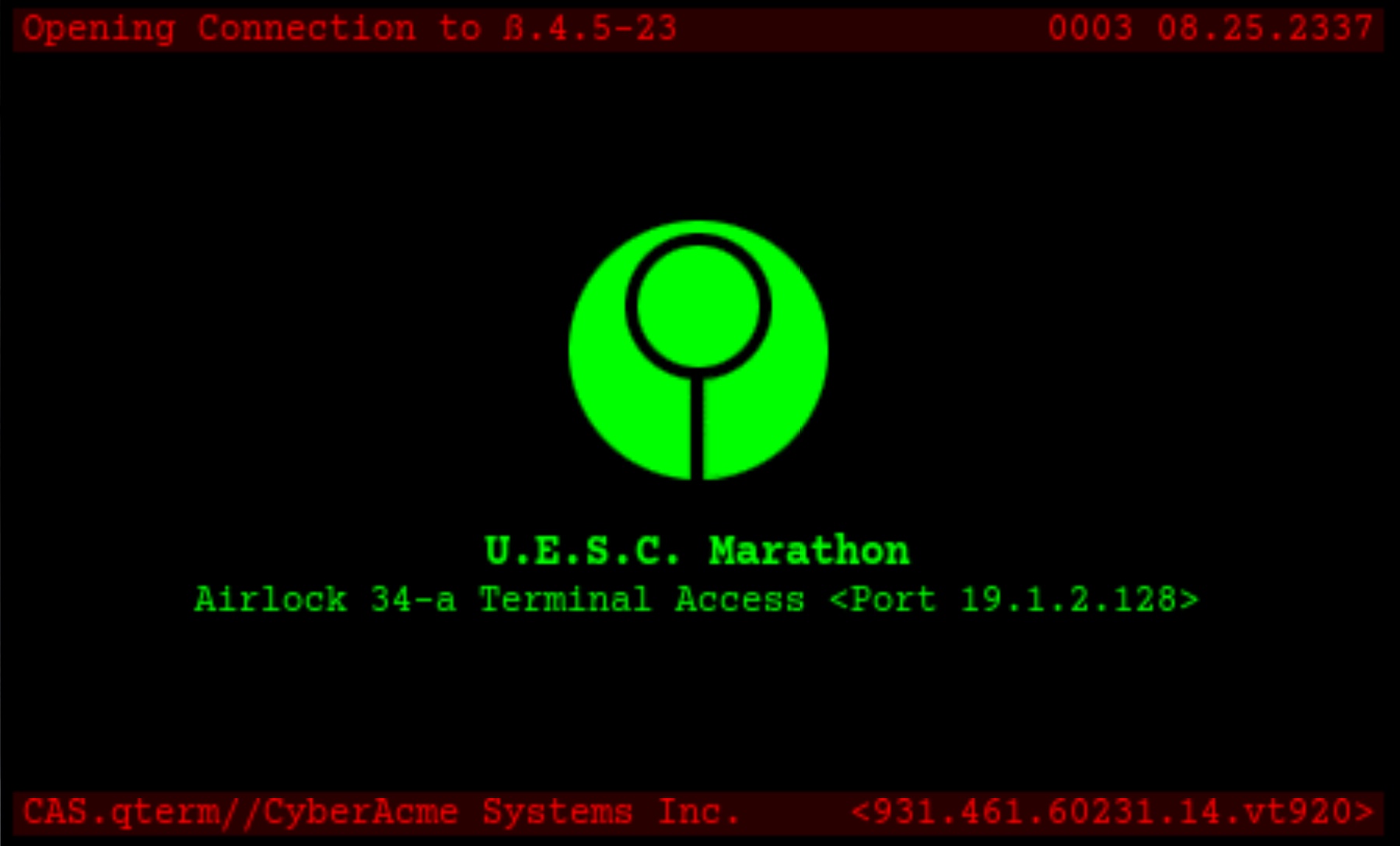 In-game screenshot of the first Marathon terminal taken five or so seconds after starting.