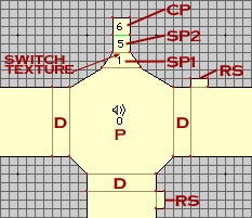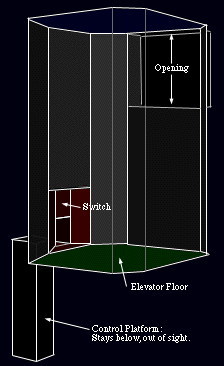 This diagram to the left shows a Floating Switch in a central pilar on a Four-Stop elevator. This is just one of the ways you can move and alter things to make new odd designs for these techniques. This particular one is from "Mr.Bill meets Gumby" (a level in Marathon:EVIL).