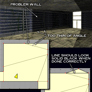 Bouncy walls can also be fixed using the Split Poly. Bouncy walls are not walls where you are trying to walk through an opening and then jerk back to the middle of the polygon. Bouncy walls are when you press yourself up to a wall and you start to jiggle uncontrollably on the wall piece. These are commonly caused by a sharp angled polygon border near the troublesome wall, or a thin polygon against that wall.