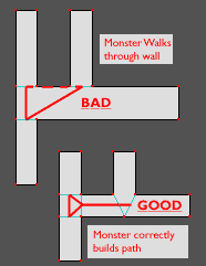 When building your maps, you'll want to keep in mind how the monsters are going to build paths. The example on the right illustrates a very common problem. In this example, if a monster builds a path along the dotted red line, it will appear to be halfway inside the wall.
