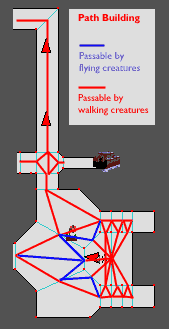 The paths in Red can be used by both walking and flying creatures. The paths usable by flying creatures only are in Blue. (Note that a walking creature can jump off an elevation - the height a monster is willing to jump from is set in the monster's physics model.) In the example, some of the blue paths could be used by walking creatures jumping down.