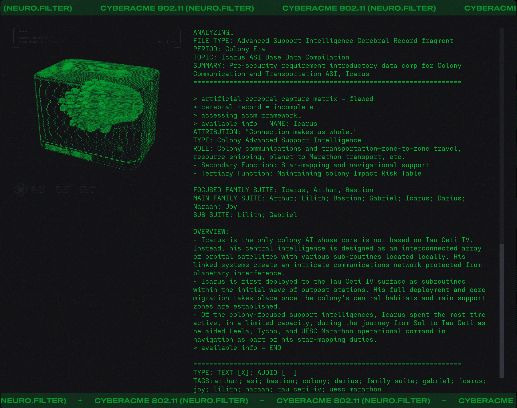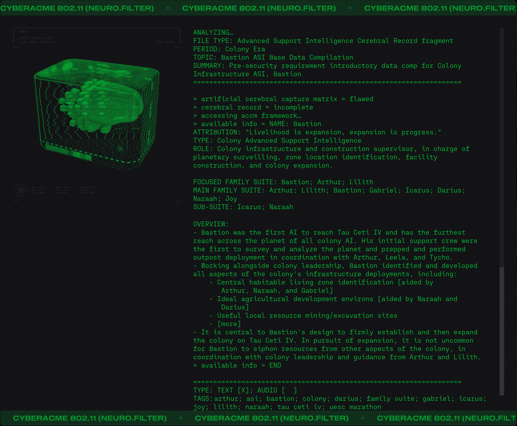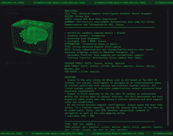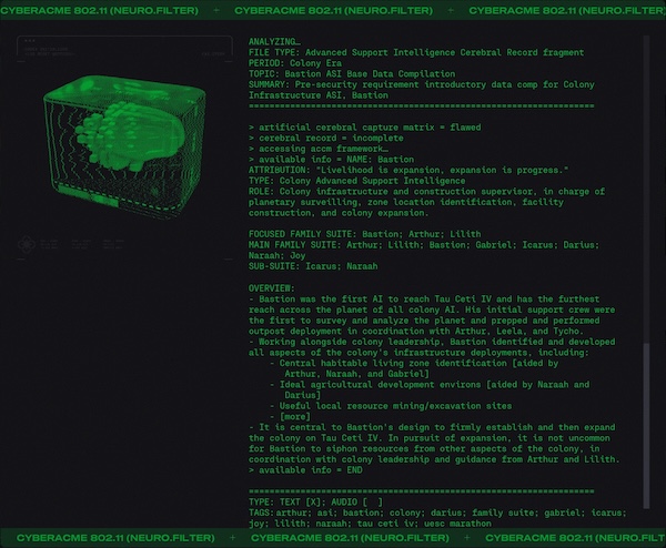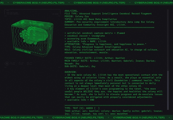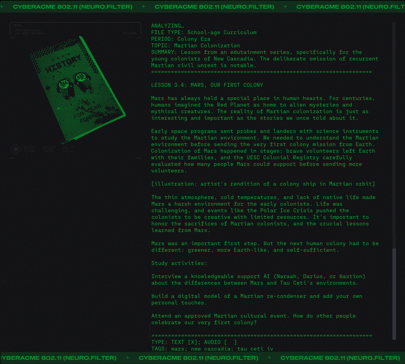 Day #1015. It's so over... But wait! There's more. Lot's more. ![]() Finally we will get to meet Durandal... face to face. But I digress. They say that "history is written by the victors" and while that may be true it is rewritten and rewritten by those with agendas. And like the hundredth copy of a third generation duplication of a substandard bootleg it becomes a little fuzzy. One might even say unreliable. What did you learn at school today? Lesson 3.4: Mars, Our First Colony. ![]() Lesson 5.25: A Watershed Famine. ![]() Because you asked for it. More Colony Lilith ![]() Bastion ![]() Gabriel ![]() Icarrus ![]() Who said there wouldn't be much reading in Marathon? There will be a test later. What's in the Box? ![]() Alien Autopsy... again. Got Marathon Merch?