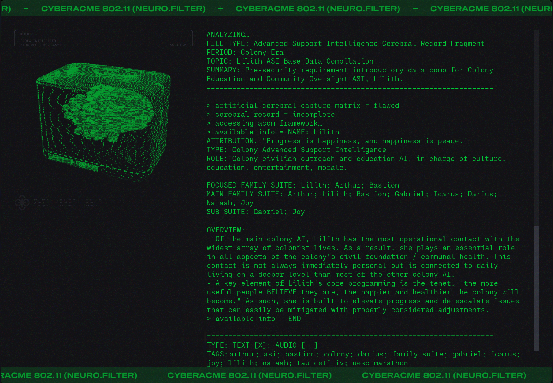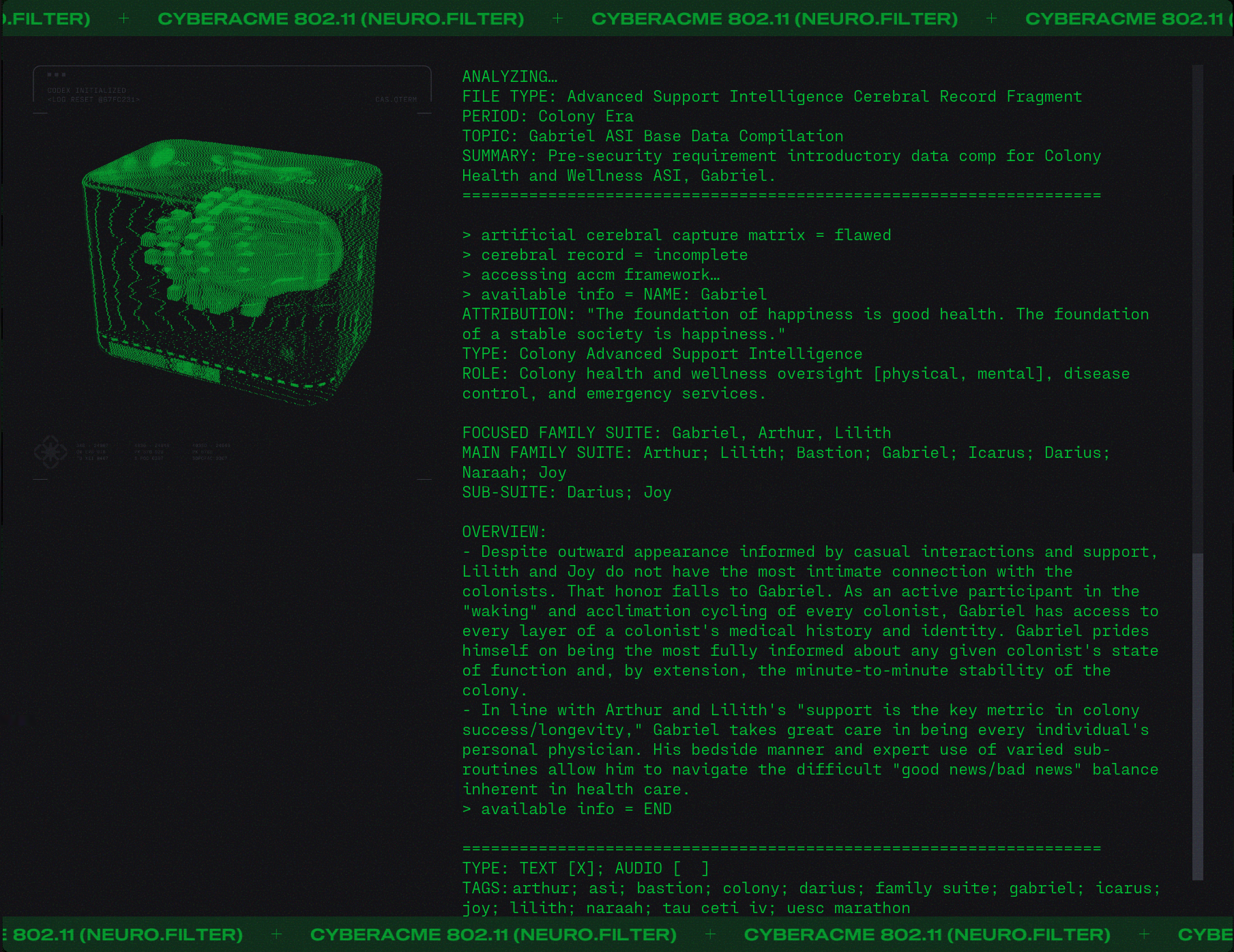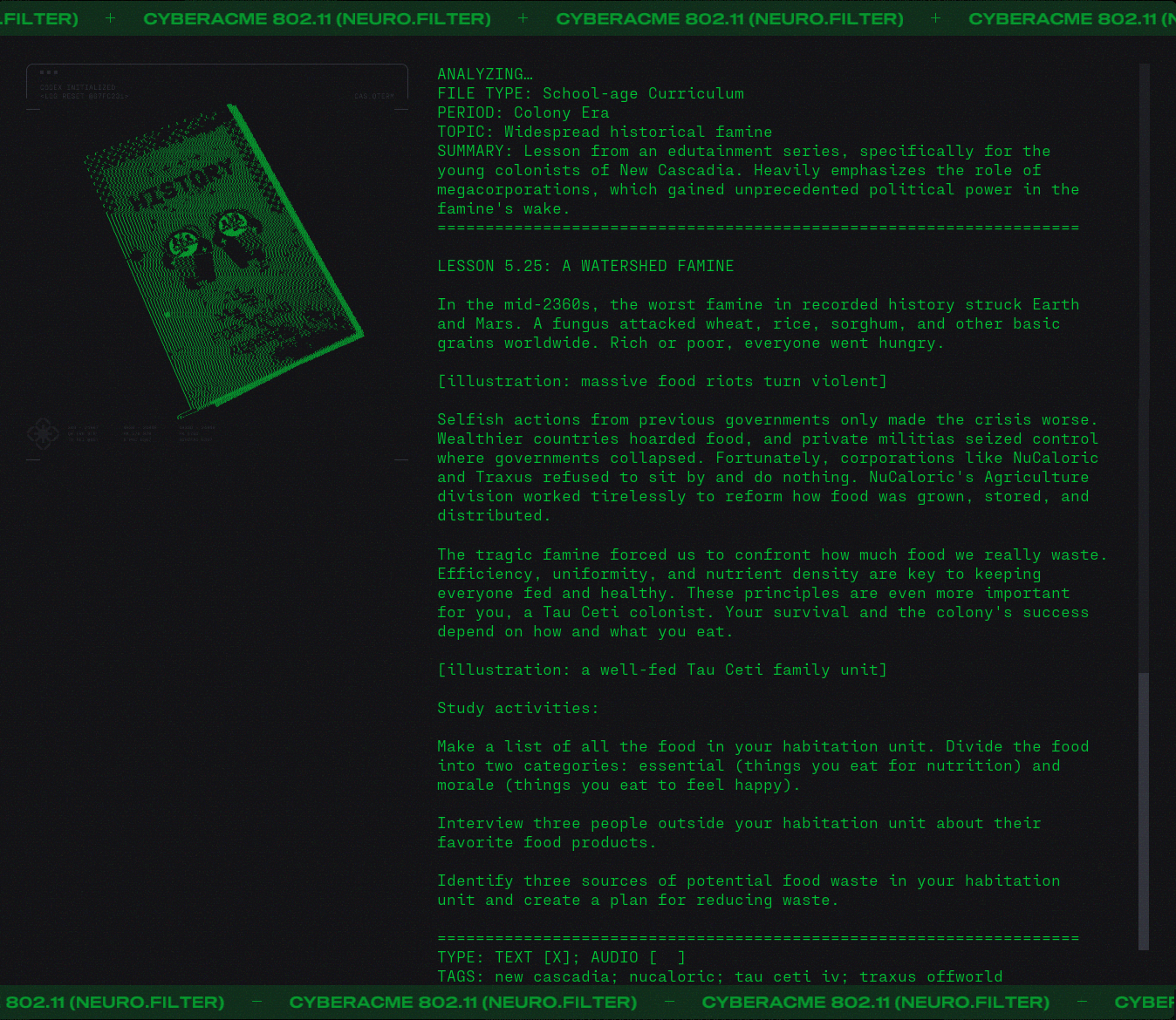 Day #1015. It's so over... But wait! There's more. Lot's more. ![]() Finally we will get to meet Durandal... face to face. But I digress. They say that "history is written by the victors" and while that may be true it is rewritten and rewritten by those with agendas. And like the hundredth copy of a third generation duplication of a substandard bootleg it becomes a little fuzzy. One might even say unreliable. What did you learn at school today? Lesson 3.4: Mars, Our First Colony. ![]() Lesson 5.25: A Watershed Famine. ![]() Because you asked for it. More Colony Lilith ![]() Bastion ![]() Gabriel ![]() Icarrus ![]() Who said there wouldn't be much reading in Marathon? There will be a test later. What's in the Box? ![]() Alien Autopsy... again. Got Marathon Merch?