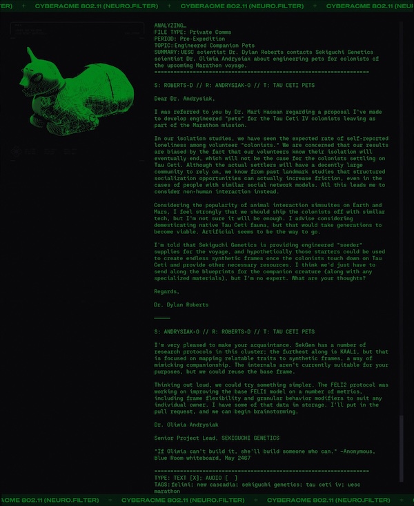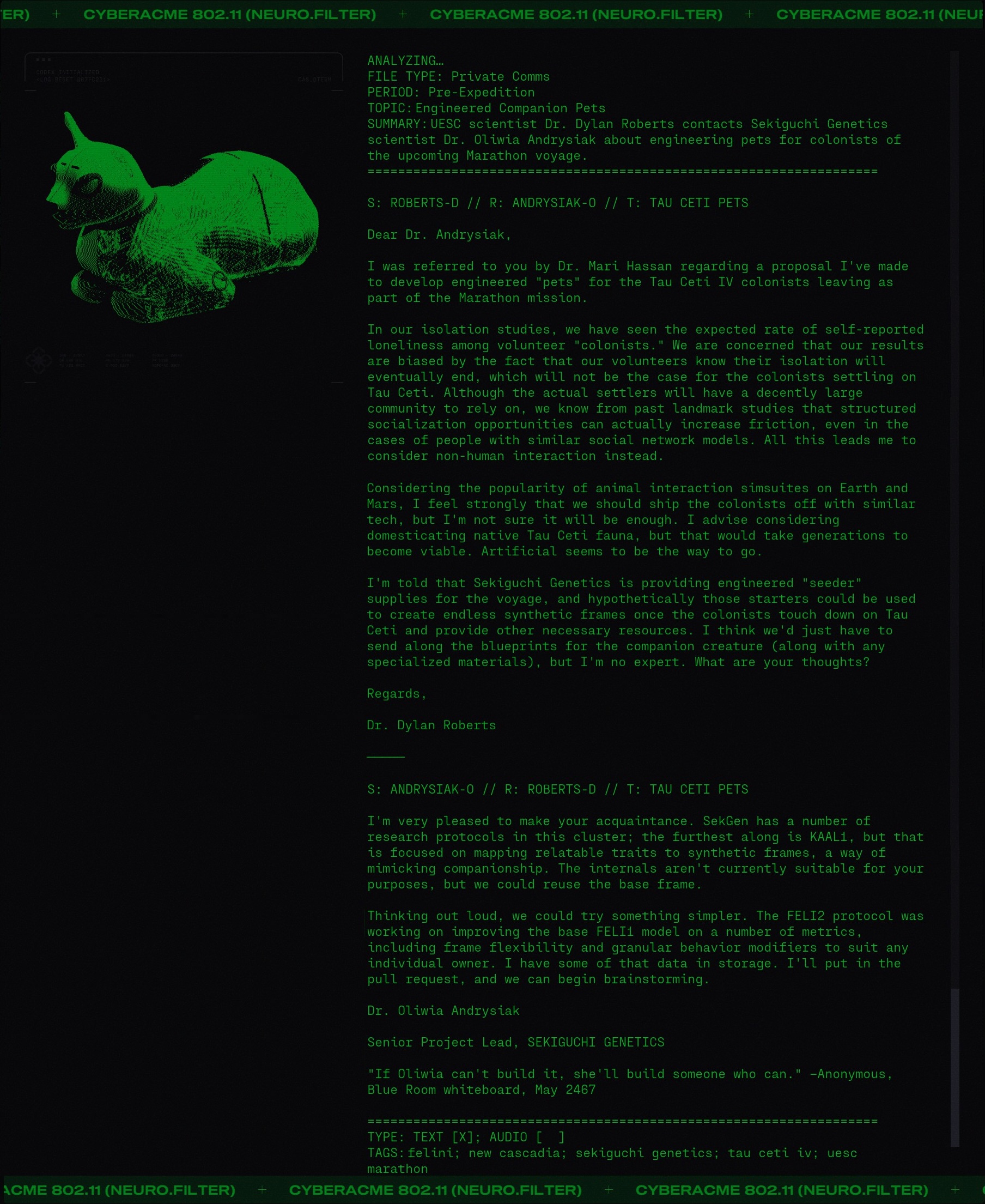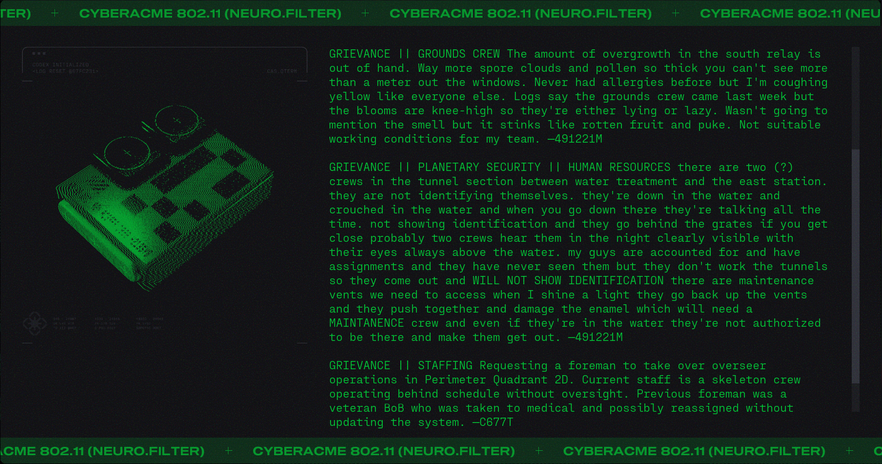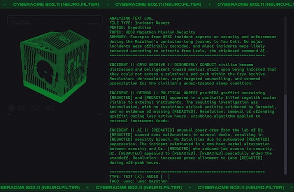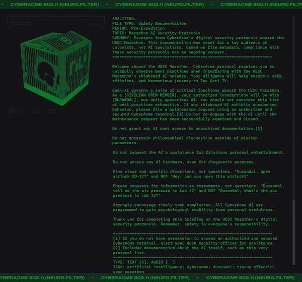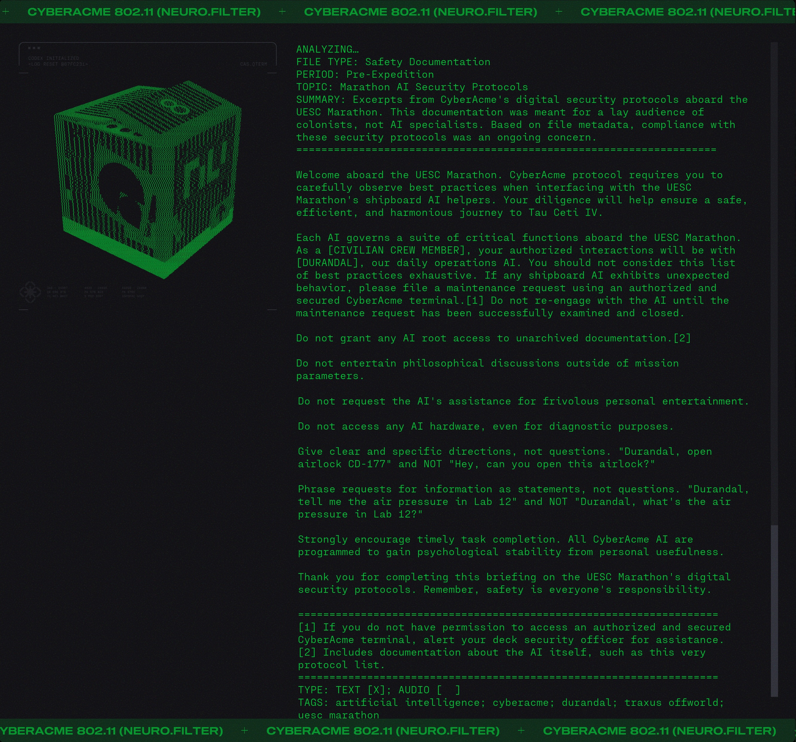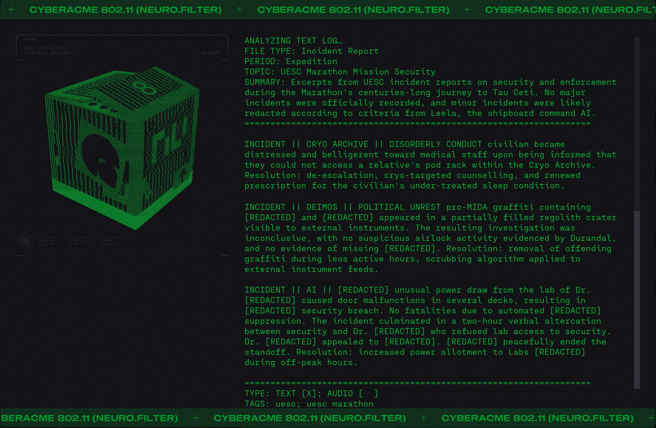 Day #1013. New month. New lore. Welcome aboard the UESC Marathon. Keep your hands and feet inside the rails at all times. Do not feed the AIs. ![]() Hey YOU! Open the Pod Bay doors. Back on July 26, 2024 we featured the humerous "My Job Is To Open and Close Doors" by Mattias Pilhede and Sai Cheung. You can see it again below. The UESC Marathon is a happy place. No major incidents to report. So says the UESC Marathon Incident Report. ![]() Pro-MIDA graffeti on the external surface of the ship (Demios). You can just imagine what that said. Fortunately it was removed... ▊ ▊ ▊ ▊ T H E U E S C Dr. Bernhard Strauss causing trouble again? If this is indeed Dr. Strauss then it must have been close to the end of the voyage as he was put into in stasis for three hundred years. A UESC Security Briefing on the Anomaly on Tau Ceti. ![]() Sounds like aliens to me. Shades of Annihilation perhaps? Annihilation is 2018 science fiction cosmic horror film in which a group of scientists enter the Shimmer, a mysterious quarantined zone of mutating plants and animals caused by an alien presence. The Shimmer appeared following a meteor crash on Earth. Inside the Shimmer the bodies of soldiers are found that have been colonized. ![]() ![]() A BoB reference. ![]() According to the Marathon manual: The original crew of the Marathon consisted of 50 Senior Staff, 1150 Officers, and 24,000 civilians all of whom were citizens of the Mars Colony or Earth. Some individuals were placed in stasis for the interstellar journey, but most civilians lived and worked on the ship and raised families there. As the crew aged, a new generation of humans were born and raised on the Marathon. By some, these children were looked down upon and called "Bob", short for born on board. These citizens grew to run the ship and many can be seen in the game running for their lives. It is your sworn duty as a security officer to protect Bob. ![]() |