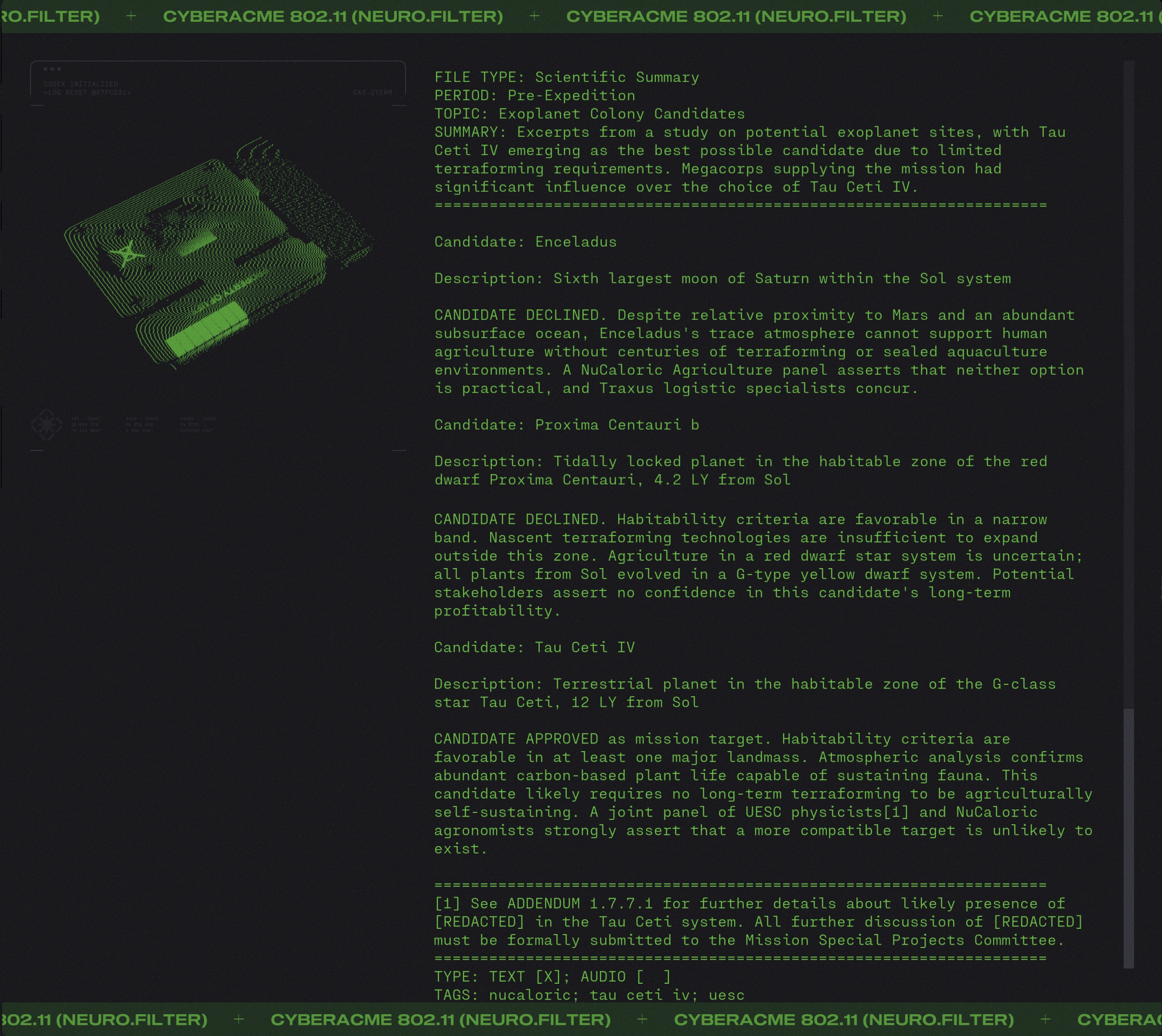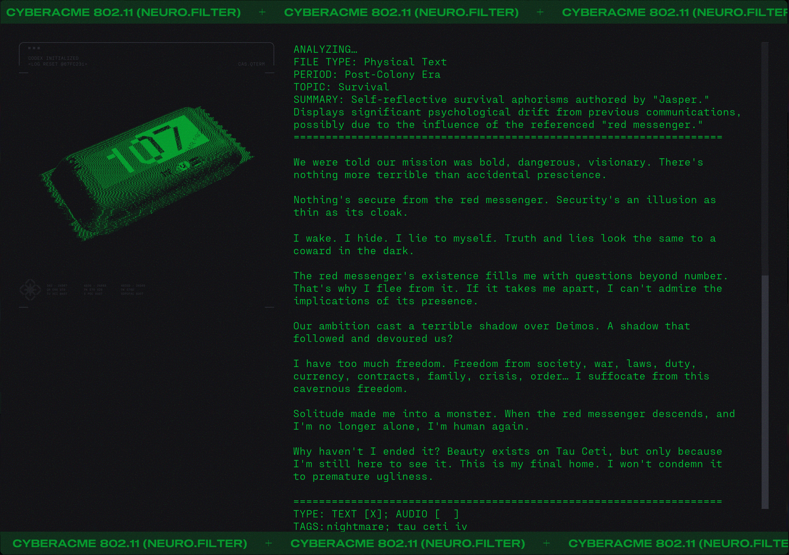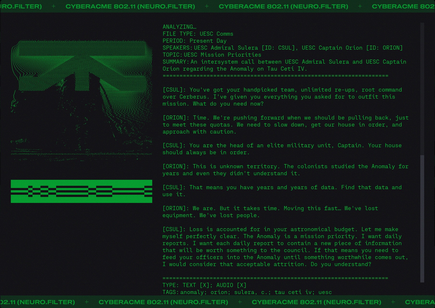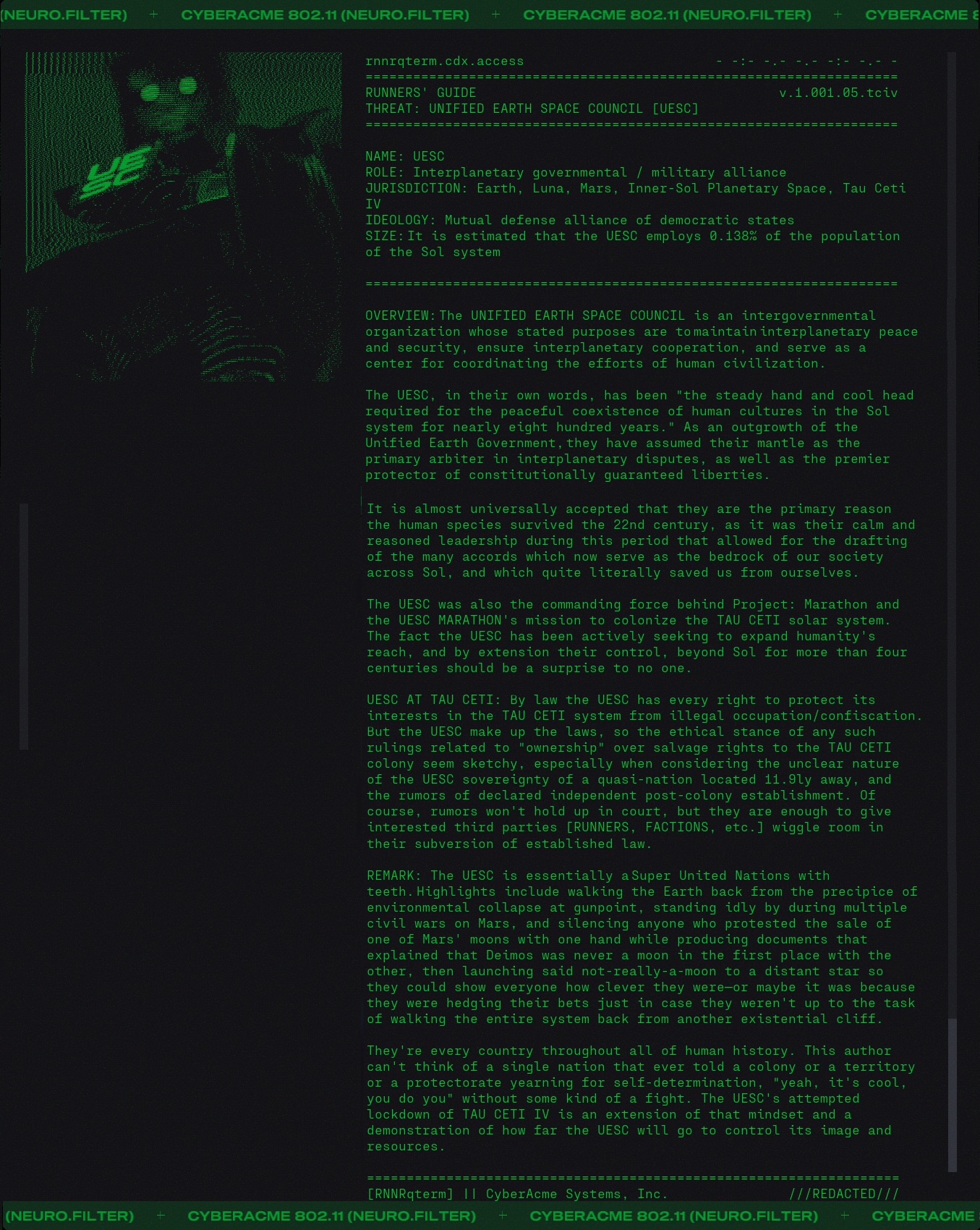 Day #1014. It's MIDA Monday. MIDA Pirate Radio returns with Mix 007. 175 NuMusic tracks for when you kill and pillage on Tau Ceti IV. The opening track is... We Stole a Moon. ▊ ▊ ▊ ▊ T H E U E S C MIDA Mix 007 comes with bespoke artwork by the insurgent known only as 'Chance'. ![]() %HERO by chance on the be damaging to the security and safety of our solar system and thus banned by order of the Unified Earth Space Council. 27.05.2888 Know your enemy. Get the latest intel on the UESC and their mission on Tau Ceti. ![]() MIDA be like... The Anomaly is bad juju and UESC Captain Orion is under pressure to deliver results. ![]() He needs more time. Would you give him more time? ![]() "Whoa, how did I get here? Man, I'm so high." Why did the UESC choose to go to Tau Ceti IV? ![]() "It's the corporations, man. The corporations run everthing." "Encalades, man. Encalades." Of course OG Marathon fans know the REAL reason why the UESC went to Tau Ceti. ![]() The Red Messanger Cometh. And it ain't Santa Claus. ![]() Bingus is antiquus! ![]() And people are shooting it as we speak! "Oh, the humanity!" |