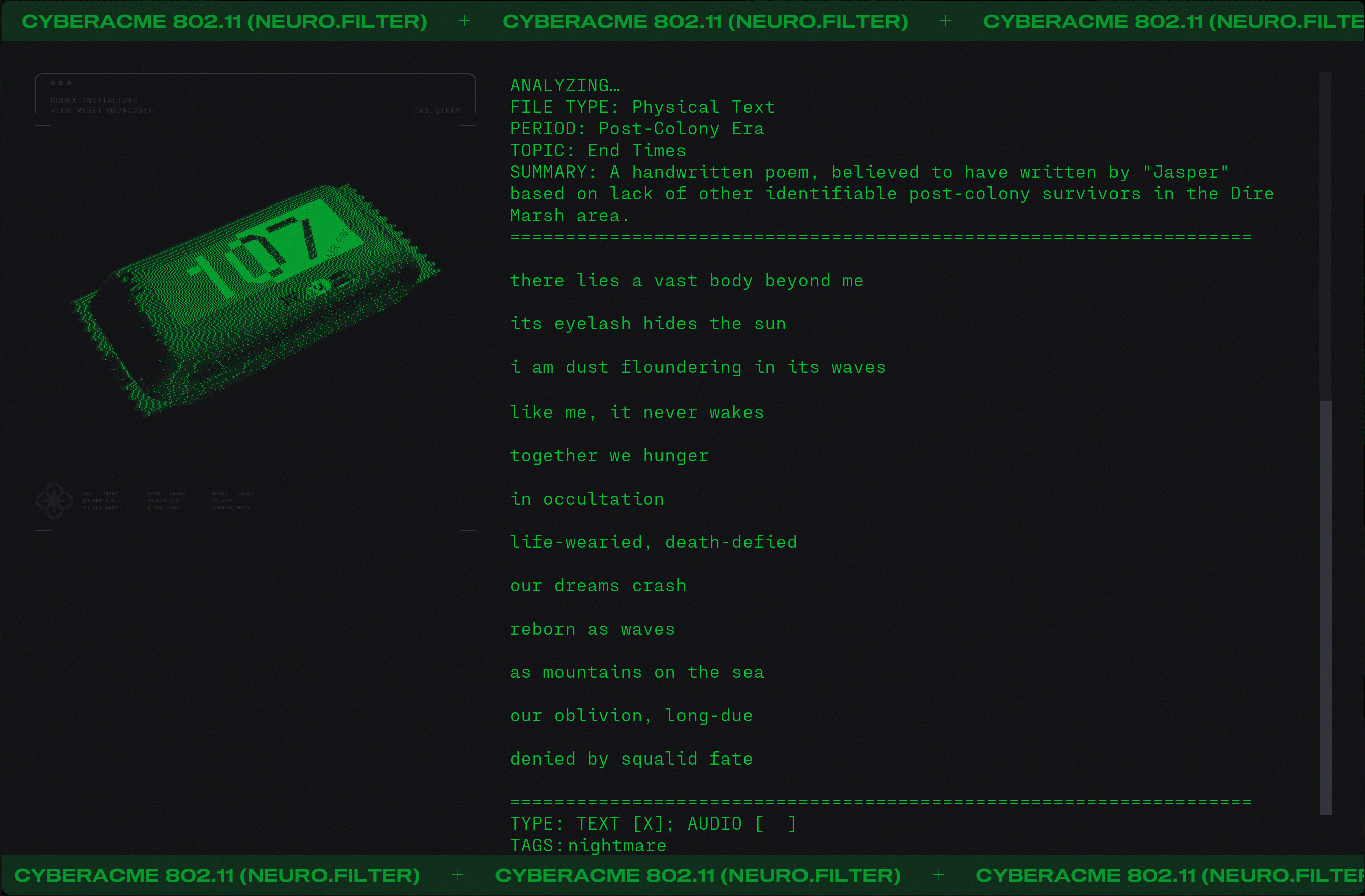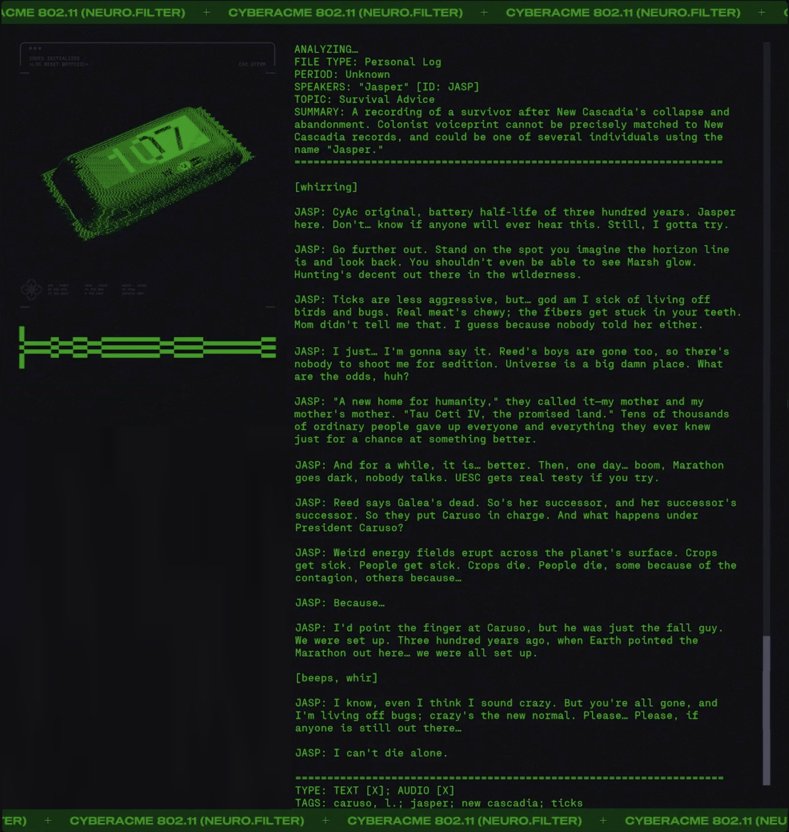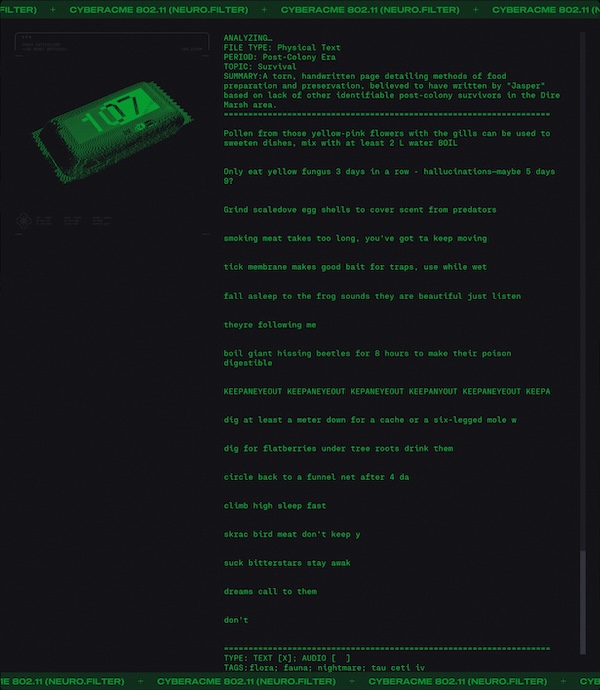 Day #1016. His elevator doesn't go all the way to the top.This is how the Pathways Into Darkness Official Hints Book described Herr Looney Tunes (an anonymous German soldier) on the level Welcome, Tasty Primate. You see... Pathways Into Darkness has Herr Looney Tunes and the tides. You know. I can't say. He who rises withOG Marathon has Gheritt White and the waves. Nu Marathon has Jasper and the waves. ![]() Jasper is a Tau Ceti post-colony survivor. How did he survive? Here's a note from his survival guide. ![]() Here's a piece from his personal log. ![]() If you don't like reading here's the audio. We featured Jasper and the Red Messanger a few days ago (March 2, 2026). Here it is again for completeness. ![]() Jasper is not alone in displaying unusual behavior. ![]() Tau Ceti be like... ![]() Never get outta the ship... never get outta the ship... |