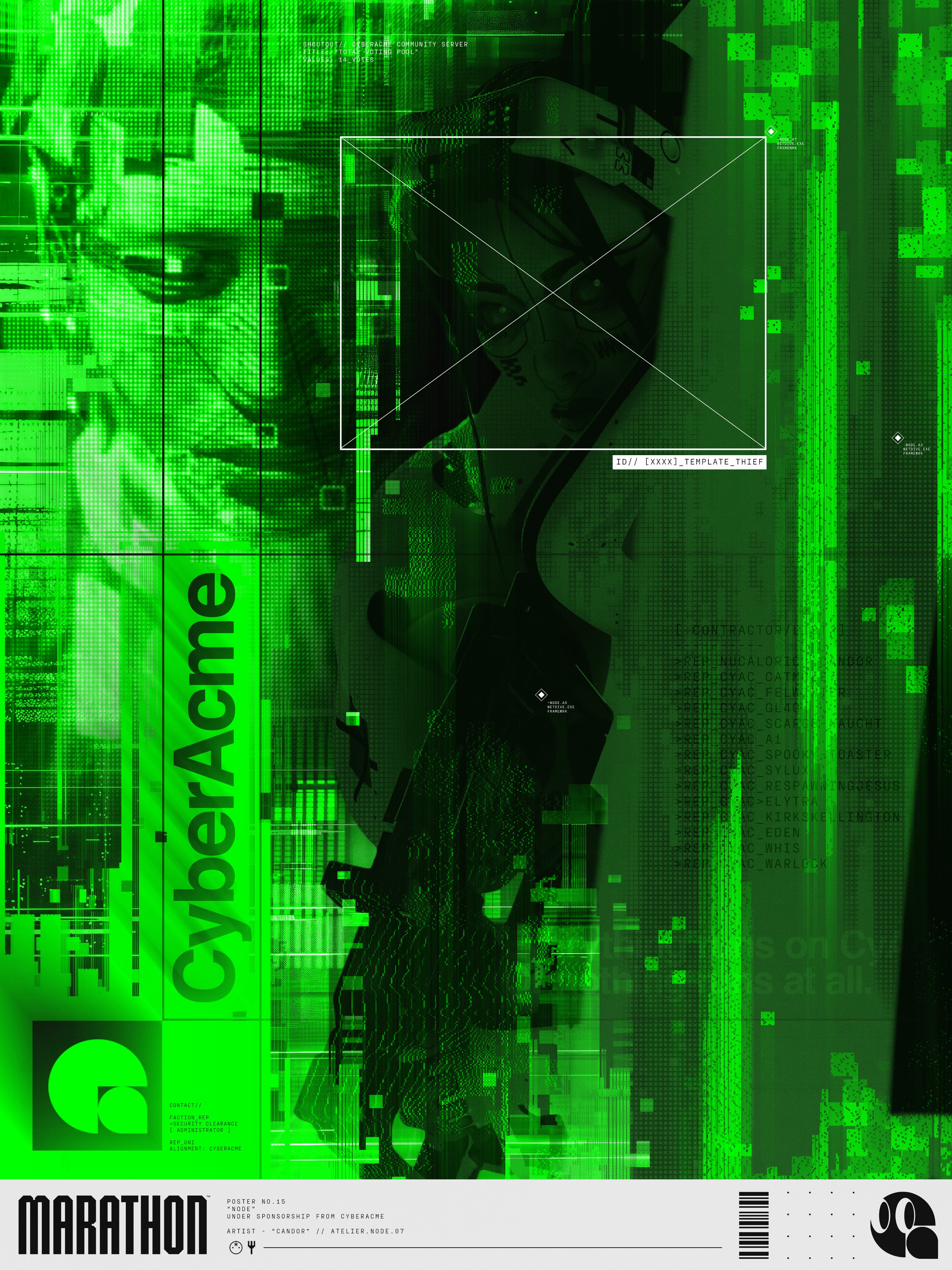 Candor (@CandorR6) continues his Marathon-inspired poster series with a striking green CyberAcme image. The alt text reads: Abstract cyberpunk composition in dominant green tones with glitch distortions and layered digital effects. Central elements include a fragmented face with visible eyes and partial features emerging from grid-like structures. Text overlays spell CyberAcme vertically and Marathon horizontally in bold fonts. Additional geometric shapes like squares and lines integrate with the design, accompanied by a circular logo and barcode-like elements at the bottom.CyberAcme dates back to the original Marathon. ![]() From the outset of the game every terminal opens with the text CAS.qterm//CyberAcme Systems, Inc. in the bottom left of the screen. ![]() When NuMarathon was announced on May 24, 2023 you could buy a CyberAcme T-Shirt.