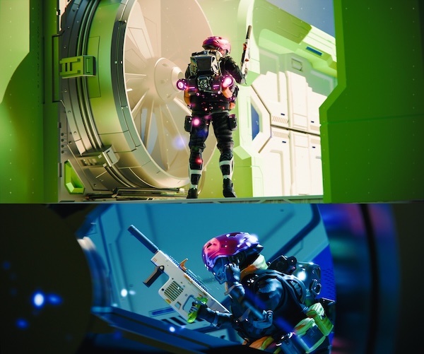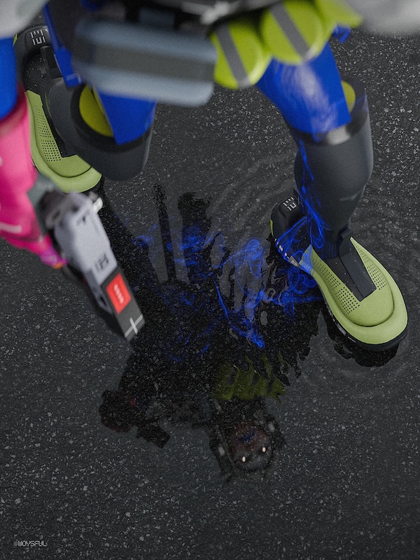 The alt text reads: Character wears a full-body blue suit with green accents on shoulders, knees, and boots, equipped with gray gadgets on chest and arms, holding a gray handgun with red trigger. Stands in shallow dark water creating a mirror-like reflection of the entire figure below. Rendered in photorealistic style with glossy metallic surfaces and subtle lighting highlights. Shadow falls on the water surface around the boots.And this spooky version the result of a glossy direct pass. Just the ticket for Halloween.