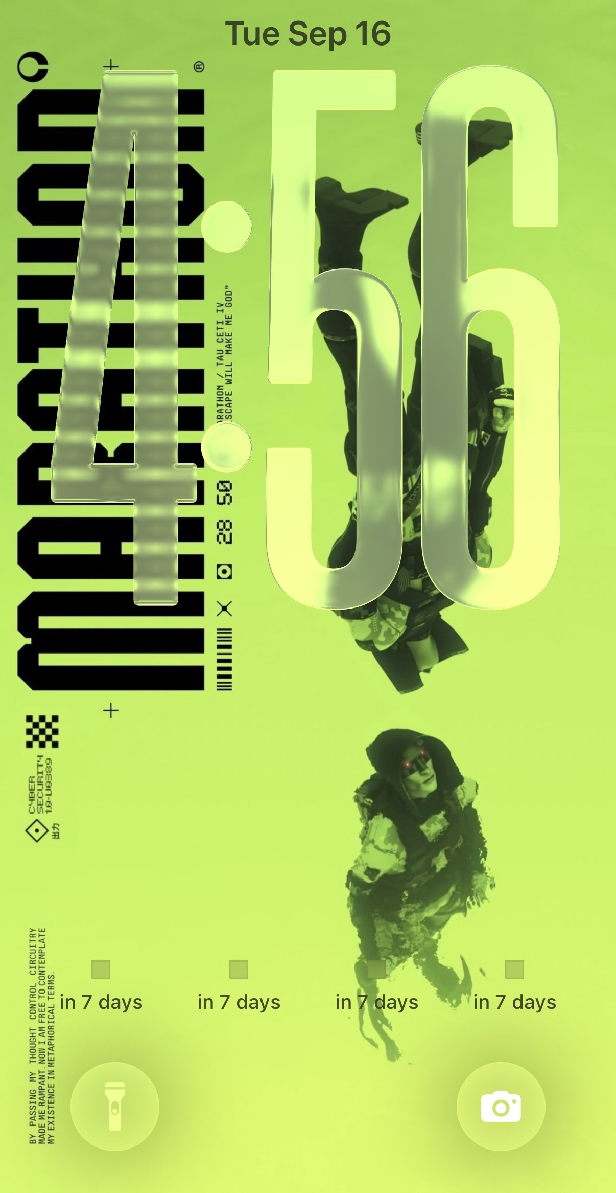 Day #866. Since the dawn of the smart phone Marathon fans have been adorning them with Marathon wallpapers. ![]() Today they have Liquid Glass. Mxdonkey1578 gives us Marathon plus Liquid Glass. ![]() Marathon plus Liquid Glass by Mxdonkey1578 on the Official Marathon Discord. September 16, 2025. To be fair a static image doesn't do this justice. The "in 7 days" is a nice touch. ![]() But I digress. Liquid Glass is Apple's radical UI overhaul to mark the next quarter century. It features a more fluid and glass-like interface recently introduced in iOS 26 and its variants. Now you can watch Void and his consciousness float on your iPhone 17 Pro Max Cosmic Orange screen. The original artwork is by Bungie's Jeremy Hanna, a concept artist on Marathon.