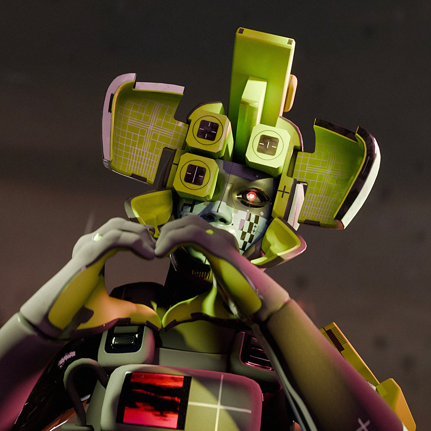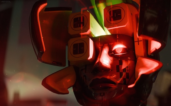 The alt text reads: Close-up view of a cyberpunk masked figure with a black and white checkered pattern on the visible face skin. The mask consists of multiple rectangular panels in orange and green hues with glowing edges forming a helmet structure over the head. Red glowing eyes peer through the central panels and angular red ear extensions protrude sideways. Subtle green lighting illuminates the dark background.We featured WoysfuL's (Call me Yui) artwork back on July 16, 2025. But it's time for a closer look. I heart you!