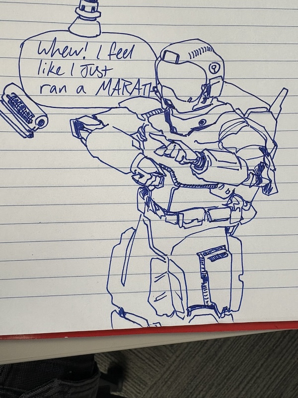 Day #843. It's sketchy Friday. We've got sketches. First up... Since we brought up White Rabbit yesterday here's a sketch by corrupt entitled "Boring class work". ![]() Boring class work by corrupt on the Official Marathon Discord. April 26, 2025. On the subject of being bored... Xavier writes: I already draw cat men when i get bored at work so i threw in a. Security meowfacer? Meowlnir recon 54? Anyway enjoy what having no eraser looks like. ![]() Meowlnir Recon 54 by Xavier on the Unofficial Marathon Discord. September 2, 2025. Meowlnir Recon 54 has a certain ring to it. Xavier did a "spot the difference game" with Meowlnir Recon 54.