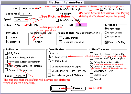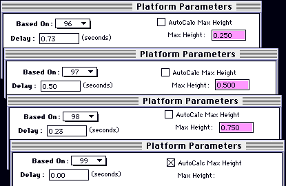 2. We set up the Platform dialogs like this. You can use the 'base-on' to set up the rest of the plats quickly, changing only the relevant parts. In our example, the relevant parts are the 'delay' and 'max height'.