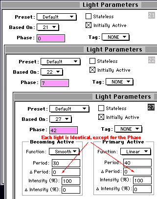 We created seven lights, and put them out of phase with each other. The phase of each light was seven more than the previous light (Ok. I admit it. I like the Number Seven. It's the best number in the world.). As you can see the first light has a phase of 0, the second one a phase of 7, and the last one a phase of 42. So what happens with these lights is this: the first light starts its cycle at game-tick=0 (there are 30 ticks in a second). The second one starts at tick 7, and so on.