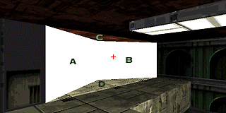 Step IV. The new polygon should have white walls and defaulted textures for the floor and ceiling, like this one shown. There is no need to change any of the textures or lights on the surfaces A, B, C and D. Leave them alone, don't mess with them because it will be a waste of time if you do.