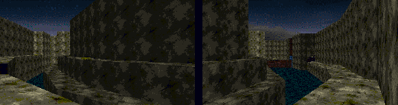 One of the first things you see in Marathon 2 after dispatching the Bobs and Pfhor cluttering up the view, are two long, flooded areas that stretch off to the left and right of the player. As you can see from the view in Forge below, the combined distance from each edge is far more than 28 world units. The trick to such long views is that the player's ability to see into the spaces is restricted. |