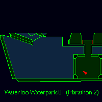 The two screen shots above were taken from the position on the map, looking straight ahead and to the player's left. The trick here is that the canyon curves out of sight in both directions, so the engine never has to display more than 28 world units in a single view, but the space that the player has to travel from one end of the canyon to the other is more than 28 world units, so it gives the impression of a huge area while skirting the 28 w.u. limit. On the left you can see the same area in Forge, with arrows showing the maximum views. With the grid on in the background (set to 1 w.u.), it's easy to see how the curving walls limit the player's view to within acceptable distances. Hastur would be ashamed if I did not show you how to make spaces that are truly immense, up to 56 world units, without the engine cracking like an arthritic knuckle in a hydraulic press. And I have learned that my Master's shame is Grendel's excruciation. Please turn your attention to the excellent Marathon 2 map, Waterloo Waterpark. |