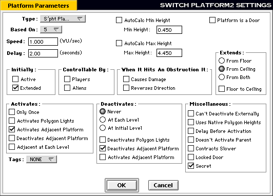The Heights are crucial for the SPs. The heights for the SP, in this example, are good level heights for the player to see the switch easily. If you are not working with a standard 0.00 floor for the elevator, then use these equations to figure out the Min and Max platform heights:
