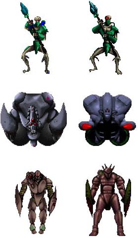Marathon 1 characters on the left, Marathon 2 on the right. Note that the Juggernaut eye pattern is identical although the Pfhor Fighters were changed.